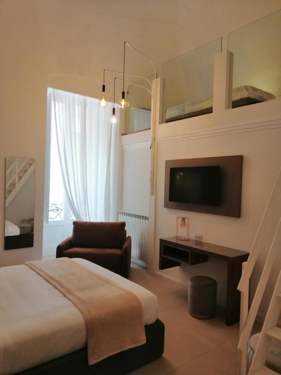 Al piano superiore, le camere spaziano dalle compatte Pretty Rooms con balcone alle più spaziose Charming Rooms con letti king size e terrazze, una delle quali dotata di piscina privata. Le suite dallo stile audace offrono tocchi di design unici, mentre le opzioni di fascia alta includono lussuosi bagni con vasca e docce spaziose. La sua posizione centrale vi permette di raggiungere a piedi il centro storico e il porto di Bari.