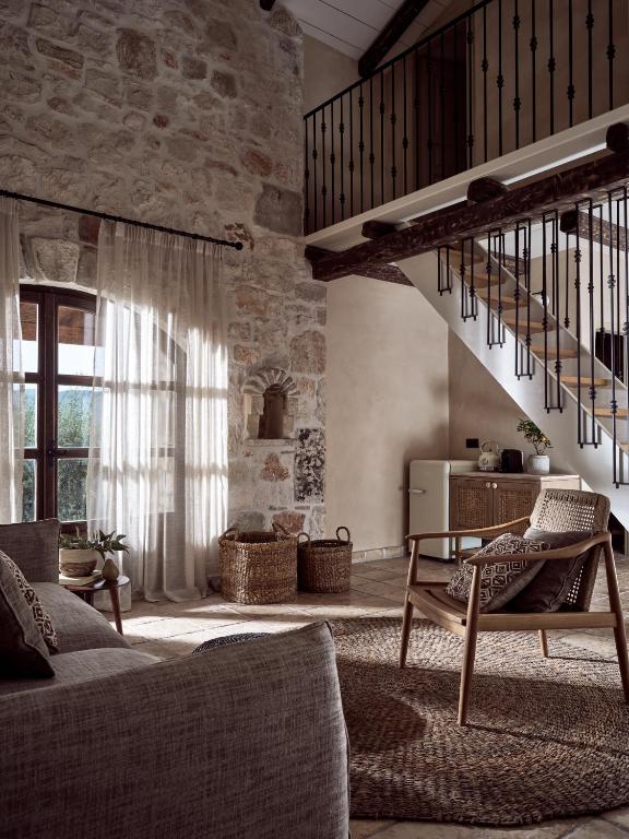 Le ville fondono il design tradizionale con il comfort moderno, con pavimenti in cotto, soffitti a volta e testiere dei letti tessute a mano. La cucina di famiglia funge ora da ristorante, dove lo chef Giannis Remos prepara i classici della cucina greca, portando avanti la tradizione secolare dei Giatria di condividere i pasti in un'atmosfera calda e familiare.